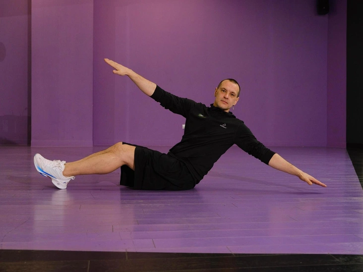 Исходное положение сидя на ягодицах, колени согнуты под тупым углом, пятки на полу. Наклоняем нейтральную спину (с сохранением легкой S-образной формы) назад и вытягиваем руки перед собой под углом 90 градусов. Разводя руки, поворачиваем грудную клетку на 45 градусов вправо и влево в медленном темпе в течение 1–2 минут, не меняя угла наклона спины. На каждый разворот делаем выдох, на возвращение к стартовому положению — вдох (читайте также: Изотоническая гимнастика: почему она лучше тренировок в зале (плюс 7 упражнений с видео)).
