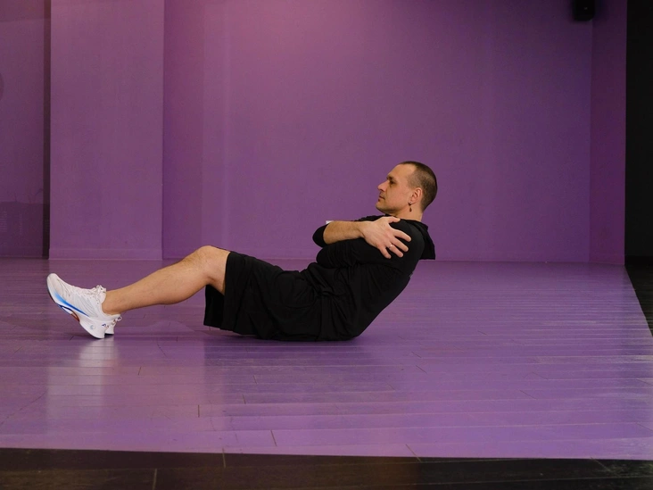 В скручиваниях крайне важно контролировать нюансы выполнения движения. Для старта нужно лечь на спину и полностью ее прижать, включая поясницу. Расслабив шею, обхватываем скрестно грудную клетку и прижимаем локти к телу. Не теряя контакта рук с телом, поднимаем спину до угла 30–45 градусов относительно пола, максимально подтягивая нижние ребра к тазу спереди. В медленном темпе, сохраняя положение, выполняем упражнение до мышечного отказа. Важно, чтобы ноги оставались расслабленными.