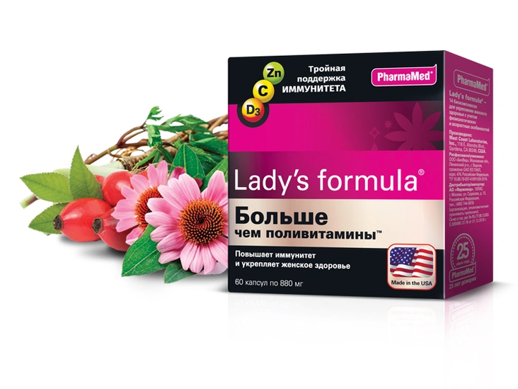 Отличную поддержку организму окажет биокомплекс Lady's formula® Больше чем поливитамины™, созданный специально для женщин. Действие препарата направлено на укрепление женского здоровья, иммунитета, повышение энергии и устранение стресса и его последствий. Он содержит 17 витаминов, 13 минералов, 5 экстрактов лекарственных растений, 2 из которых с фитоэстрогенами.