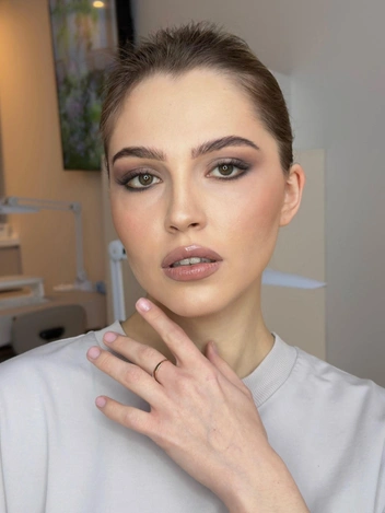 Последний штрих — растушевываем карандаш для губ и добавляем блеска натурального оттенка. В нашем случае мы выбрали холодно-коричневый. Иногда встречаются примеры этого вида макияжа с красной помадой, но это подойдет не всем — можно рассмотреть такой вариант, если у вас смуглая кожа и красный цвет не будет чрезмерно выделяться на вашем лице.