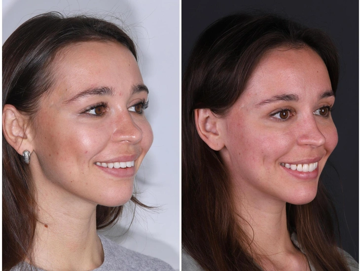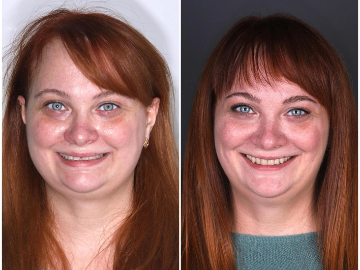 Пациентка обратилась к нам с жалобами на промежутки между зубами и недовольством своей улыбкой. Ранее в других клиниках ей говорили, что не удастся исправить ситуацию без виниров, но у нас все получилось. Изменилась не только улыбка, но и лицо в целом, оно стало расслабленным.