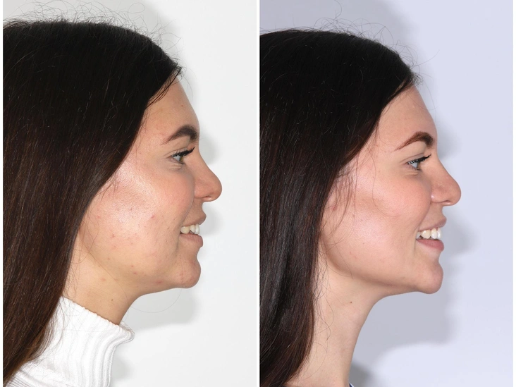 Эта пациентка лечилась с помощью элайнеров полтора года. До лечения у нее был открытый прикус, негармоничная арка улыбки. Мы скорректировали смыкание зубов и прикус, в результате улучшились пропорции лица. подбородок стал более оформленным, а овал — четким. Можно увидеть, какой чистой и красивой стала линия нижней челюсти.