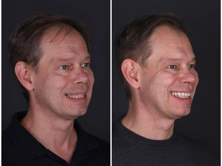 Это пример того, как лицо можно изменить без помощи именно ортодонтического лечения. Пациент хотел улучшить эстетику улыбки, но оставить ее максимально естественной. Мы установили ему 10 единиц керамических виниров, и в результате изменилось даже выражение лица — оно стало более мужественным и расслабленным одновременно.