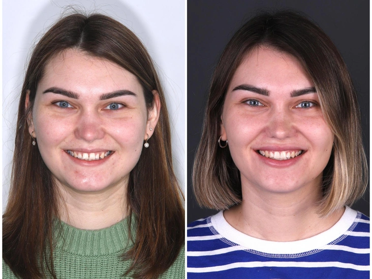 До лечения пациентку беспокоили большие промежутки между зубами, в других клиниках говорили, что закрыть их не получится. Но нам удалось избавиться от промежутков, поработать с нижней третью лица, высотой и наклоном прикуса. В результате, как мы видим, у девушки стали более четкими скулы и овал лица, улыбка — естественной и уверенной.