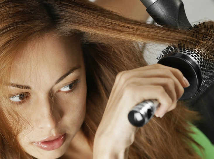 Щетина брашинга при этом должна почти касаться корней, а струя горячего воздуха идти по направлению вниз.