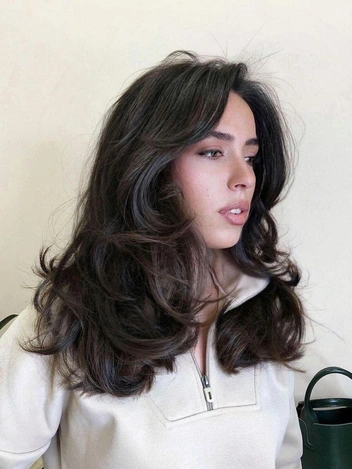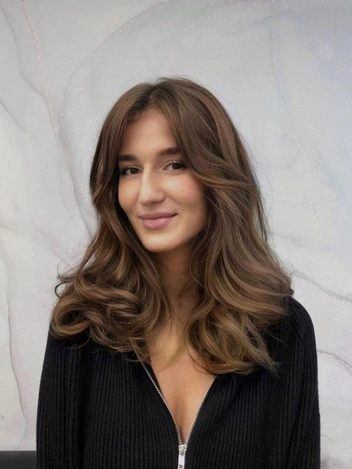 Третий образ — каскадная стрижка с челкой, которая быстро стала популярной. Длинные пряди мягко обрамляют скулы и подчеркивают черты лица, придавая взгляду загадочности. Этот стиль с легкими слоями подойдет тем, кто хочет добавить объема и движения своим волосам. Челка при этом может быть как длинной и свободной, так и слегка градуированной, что сделает лицо более выразительным.