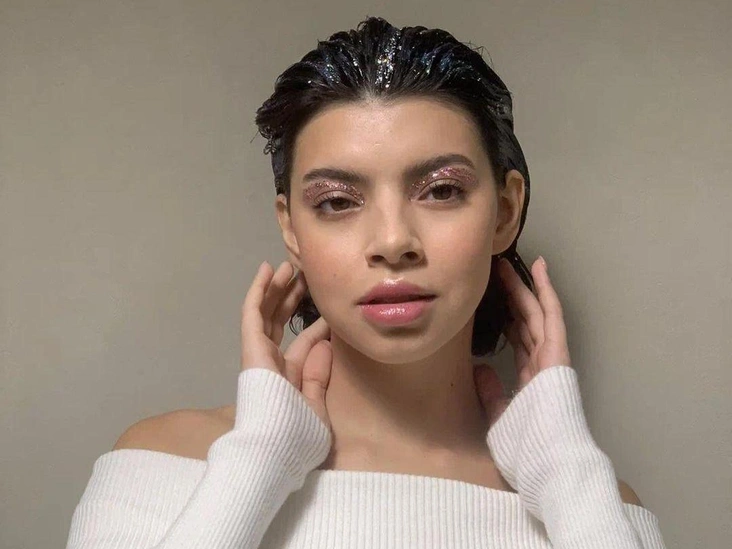 Если же вам нужен еще более праздничный вариант, в гель можно добавить глиттер. Тут уж точно есть, где разгуляться фантазии. Можно сделать металлический эффект, распределив глиттер по всем волосам. Или использовать разный глиттер и добавить не только блеска, но и больше цвета. А можно и вовсе взять глиттер с большими деталями — стразами, звездами, сердечками — и перенести нашумевший макияж из сериала «Эйфория» на волосы.