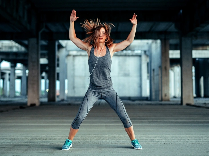 Исходная позиция: стоя, ноги вместе, руки опущены. Отсюда делаем прыжок с двух ног на две, раскрывая их в стороны, и добавляем подъем рук над головой через стороны. Сюда же можно добавить присед после раскрытия ног в стороны.