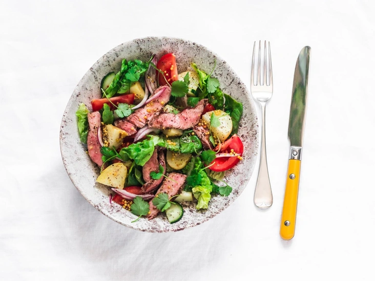 Обед: 100 г вареного мяса с 2 отварными картофелинами и 4 листьями салата