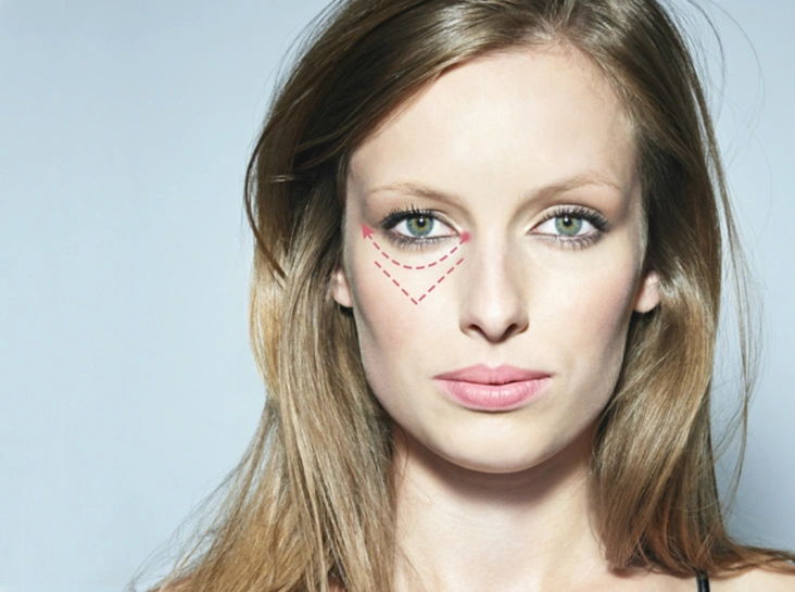 Консилер нужно наносить в несколько этапов. Сначала прорисуйте треугольник, как показано на рисунке. Затем нанесите покрытие на всю зону нижнего века, растушевывая вниз. Таким образом вам необходимо зарисовать весь треугольник. Потом аккуратно растушуйте спонжем или пальцами границы, чтобы они слились с остальным тоном. Теперь более светлым оттенком высветлите ложбинки у внутренних уголков глаз — этот оптический обман распахнет взгляд и смягчит недостатки.
