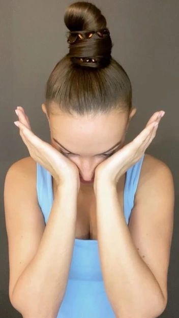 Медленно поднимите ладони к вискам и зафиксируйте натяжение тканей. Постойте в таком положении несколько секунд, опустите руки. Чтобы добиться омолаживающего эффекта, повторяйте упражнение не менее 4 раз. Старайтесь во время массажа дышать спокойно, размеренно.