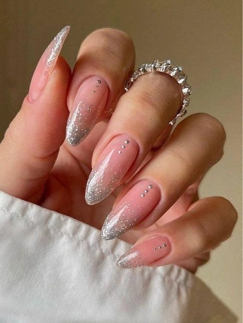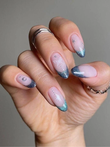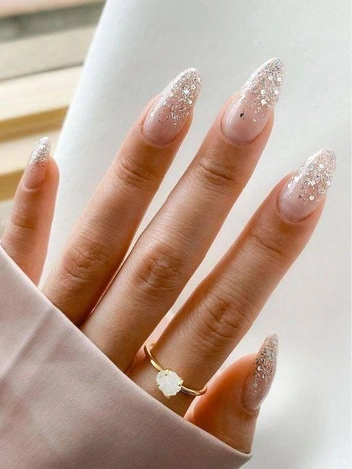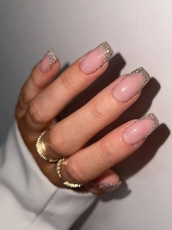 Пожалуй, самый праздничный оттенок глиттера — с отливом серебра. Чтобы дизайн выглядел более празднично, рекомендуем покрывать мерцающим лаком всю ногтевую пластину. Если же сияния не хватает, не бойтесь добавлять как можно больше глиттера.