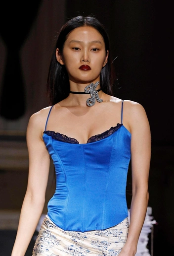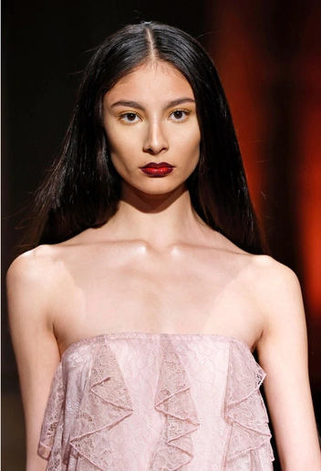 Черные губы, как на показах Mark Fast и Rodarte — это, конечно, прием для самых смелых. Если вам нравится идея, но вы пока не готовы к полной ее реализации, я бы посоветовала воплотить в жизнь облегченный вариант. К примеру, как у моделей Talia Byre (черные уголки) или Kim Shui (темный контур и красная помада). Техника воспроизведения последнего предельно проста: вам понадобится черный или темно-коричневый карандаш, с помощью которого нужно обозначить контур и слегка заштриховать внутреннюю часть губ. Затем, при помощи кисточки, растушевать его и нанести красную помаду. Линию перехода тоже нужно будет немного сгладить (читайте также: Сделают вас моложе: 5 лучших оттенков помад для женщин старше 40 лет).
