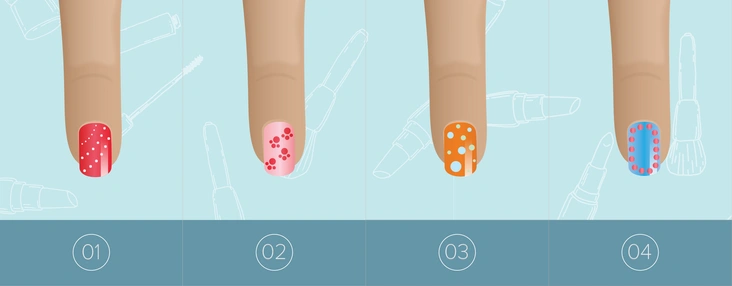 Накрасьте ногти, дайте лаку хорошо просохнуть и поставьте по одной контрастной точке около кутикулы. Чтобы разнообразить этот вариант, попробуйте поставить три точки в линию – от большей к меньшей. Если у вас нет трех доттеров разного размера, просто нажимайте на доттер посильнее, чтобы поставить точку большего диаметра и слегка коснитесь им ногтя, чтобы получить маленькую точку.