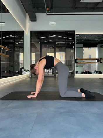 Встаньте на четвереньки, ладони под плечами, колени под тазом. С выдохом медленно округлите спину, позвонок за позвонком, как будто хотите спрятать живот. На вдохе, наоборот, мягко прогнитесь, вытягивая позвоночник от таза до шеи.