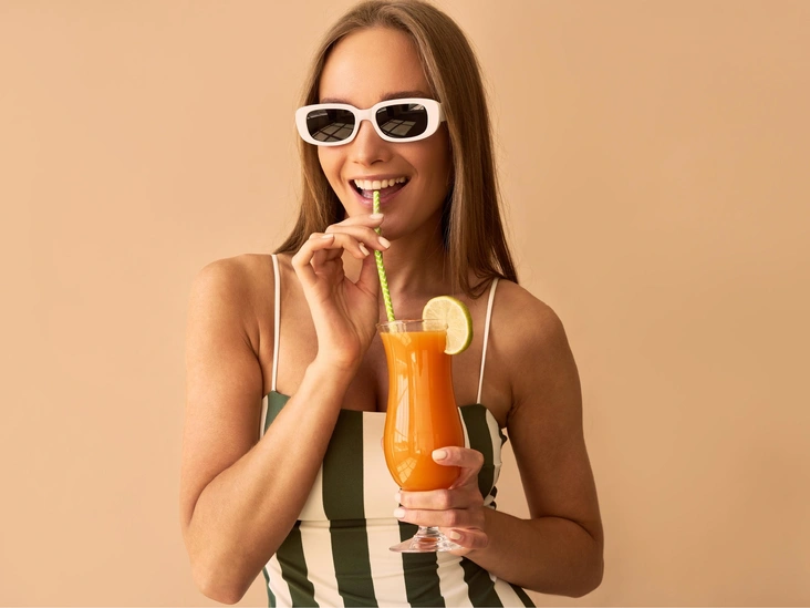 Многие знают, что этот напиток является хорошим усилителем положительного солнечного воздействия. Объясняются его свойства высоким содержанием бета-каротина, который делает кожу упругой и облагораживает оттенок загара.