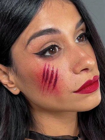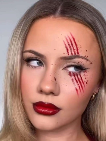 Такой макияж на Хэллоуин выглядит эффектно и при этом не требует сложных материалов. Красные линии на щеке создают впечатление царапин, а аккуратный мейк делает образ выразительным, но не тяжелым. Макияж на Хэллоуин для девушек в этом стиле подойдет тем, кто хочет добавить немного дерзости, сохранив естественность.