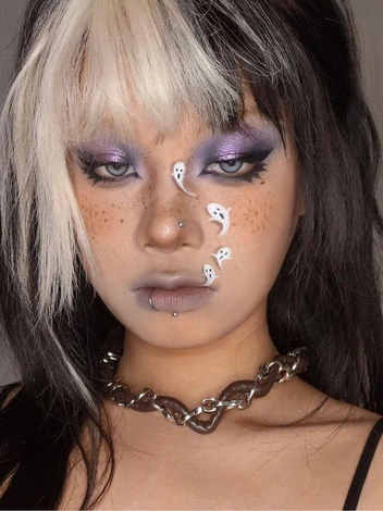 Этот макияж на Хэллоуин легкий, светлый и немного игривый. Он подойдет тем, кто хочет создать атмосферу праздника без пугающих деталей. Макияж на Хэллоуин для девушек с рисунками призраков на лице выглядит мягко и привлекательно.
