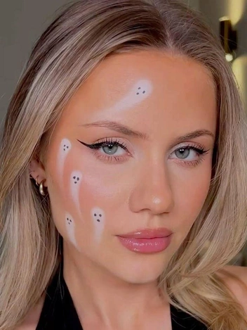 Нанесите легкий тональный крем с сияющим финишем. Белой краской или жидкой подводкой нарисуйте на щеках и лбу маленькие каплевидные формы — это будут призраки. Добавьте черные точки для глаз и рта. Чтобы рисунок выглядел живее, слегка растушуйте края.