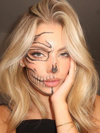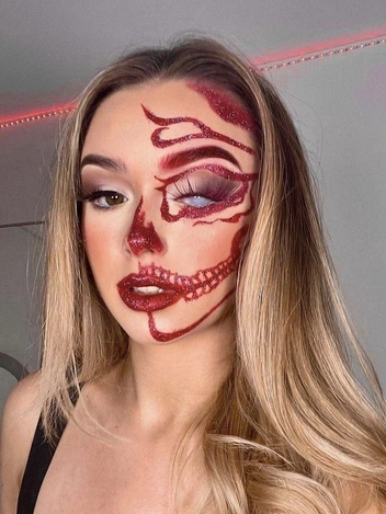 В этом образе легкий хоррор сочетается с чистотой линий и блеском. Макияж на Хэллоуин создает впечатление, будто часть лица открывает анатомию, но выглядит при этом празднично и аккуратно.