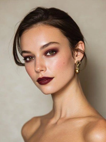 Глаза можно подчеркнуть нейтральными тенями и тонкими стрелками. Такой прием делает взгляд выразительным, но не перегружает его. На губы нанесите глубокий винный или бордовый оттенок.