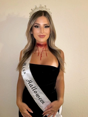 Волосы можно собрать в пучок или накрутить крупные локоны. Контраст ухоженного макияжа на Хэллоуин и мрачной детали создает нужное впечатление.