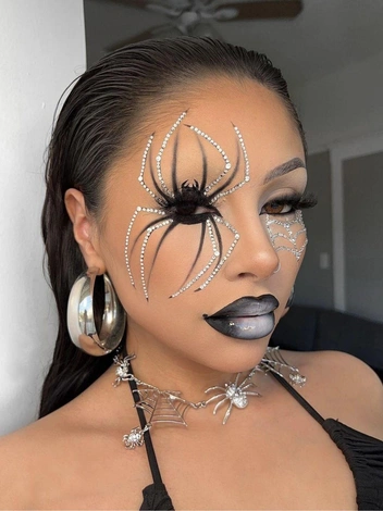Этот макияж на Хэллоуин сочетает элегантность и легкую загадочность. Вместо привычного ужаса — блеск, геометрия и внимание к деталям. Макияж на Хэллоуин для девушек с элементами паутины выглядит необычно, но при этом его можно сделать самостоятельно.