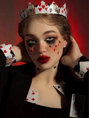 Этот макияж на Хэллоуин сочетает контраст и эмоцию. Красные губы, темные тени и карточные символы создают впечатление образа с характером. Макияж на Хэллоуин для девушек в таком стиле выглядит выразительно, но сделать его самостоятельно несложно.