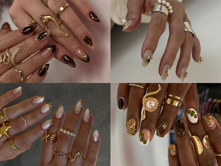Отсюда в маникюре начнут появляться яркие золотые акценты, крупные камни, жемчуг, черепаховый узор и 3D-украшения, а лучше — все вместе. Кстати, сочетать такие ногти лучше всего с большим количеством колец, повторяющих элементы из дизайна.