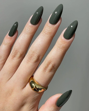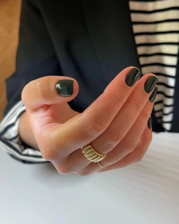 Маникюр в темно-зеленом оттенке — мастхэв для тех, кто пока не готов расставаться с летом. Этот глубокий и насыщенный цвет сделает осенние образы более теплыми и уютными. Самым выигрышным вариантом станет глянцевое покрытие, однако маникюр с матовым финишем тоже окажется интересным.
