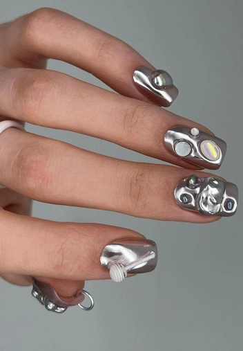 Лайфхак по тому, как идеально вписать трендовые металлические элементы в маникюр — поддержать по цвету свои украшения и чувствовать, как весь образ преисполнился в своей гармонии. В моде сейчас объемные металлические элементы — капли, подтеки. Можно также попробовать френч с эффектом металлик.