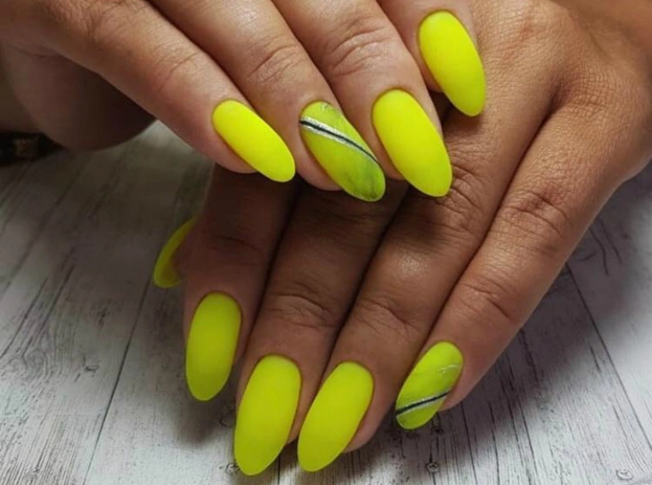 Этим летом необыкновенно популярны яркие, кислотные цвета: желтый, зеленый и оранжевый. В таком ярком маникюре допускаются узоры, но они должны быть максимально лаконичными и контрастными. Он отлично сочетается как с пляжными луками, так и с официальным офисным стилем.