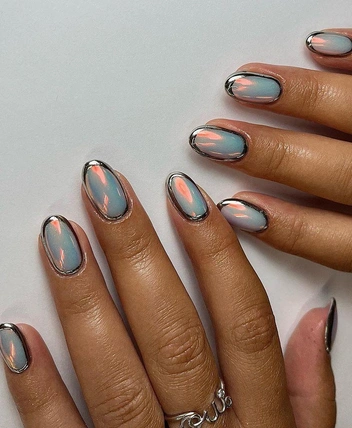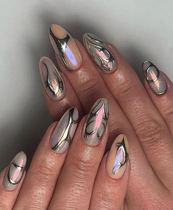 Поклонникам блестящего маникюра понравится дизайн в стиле металлик — этот нейл-арт сейчас на пике популярности. Вариантов много: от объемных узоров до необычных сочетаний с разноцветной втиркой. Также можно комбинировать металлик с матовой базой или «голыми» ногтями с прозрачной основой (читайте также: Блестящий маникюр на осень: 7 самых модных идей, которые разнообразят скучный нюд).