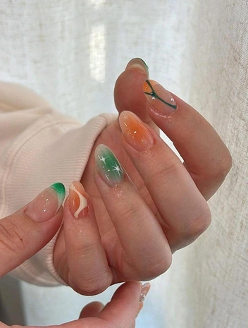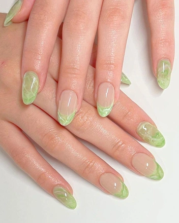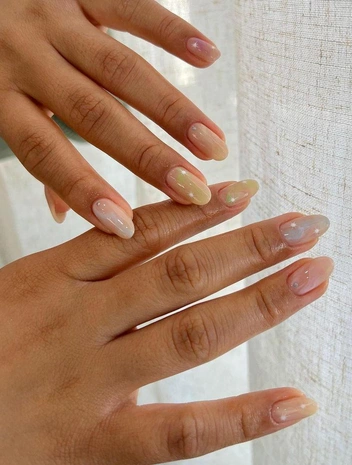 Овальные ногти выглядят очень нежно и утонченно, подчеркнуть этот эффект поможет дизайн с полупрозрачными разводами. Особенность нейл-арта в градиенте, который создает эффект акварельных полуразмытых мазков — получается романтичный, но необычный нейл-арт, цепляющий взгляд. Дополнить маникюр можно с помощью акцентных узоров, наклеек или френча.