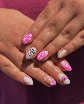 Сочетание дизайнов между собой — один из главных трендов нейл-арта уже несколько лет. Комбинации могут быть самыми безумными, ведь удачным сочетание делают одинаковая цветовая гамма и единый стиль рисунков. Посоветуйтесь с мастером: он подскажет, какие дизайны будут выглядеть гармонично друг с другом.