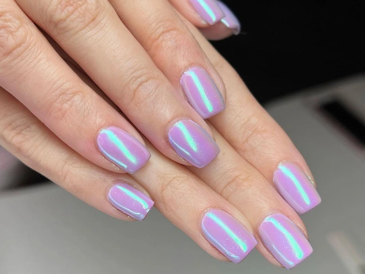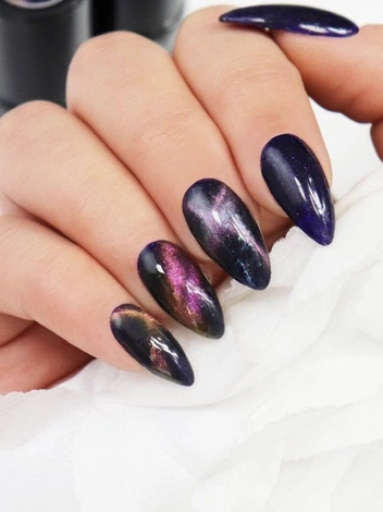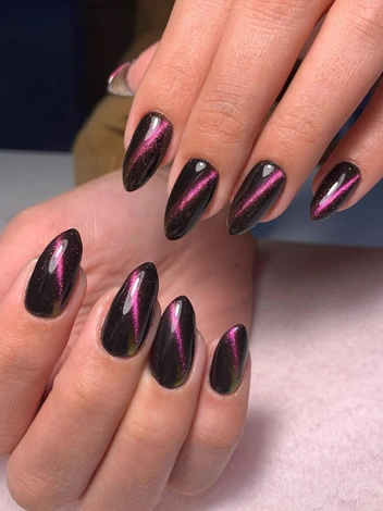 Специальные лаки содержат несколько видов разноцветных металлических частиц, позволяя создавать неоновый объемный блик на темном фоне. Этот маникюр выглядит абсолютно нереальным. А в сочетании с различными арт-техниками для «кошачьего глаза» эффект лишь усиливается, в результате чего рисунок становится очень необычным и креативным. Отлив лака зависит от освещения, но стабильно будут присутствовать две цветные полосы.