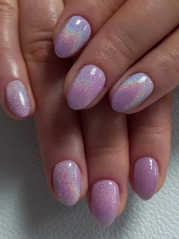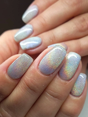 Гель-лак с эффектом призмы появился относительно недавно и начал пользоваться огромной популярностью. Его также называют «радужный кошачий глаз». Особенностью этой вариации является радужный блик: как призма раскладывает свет в спектр, так и металлические частички этого лака по-разному отражают свет, образуя радугу на поверхности ногтя.