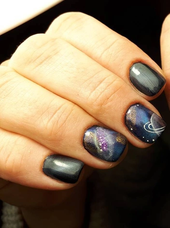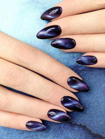 Создатели этой техники явно вдохновлялись астрономией, в частности туманностью созвездия дракона, которая носит одноименное название. Для достижения такого эффекта мастер использует несколько оттенков лака с металлическими частичками. Поверхность ногтя заполняется ими в хаотичном порядке, а после при помощи магнита блестки сдвигаются в нужную локацию или по нужной форме. Этот эффект отлично дополняет дизайн созвездий или туманностей.
