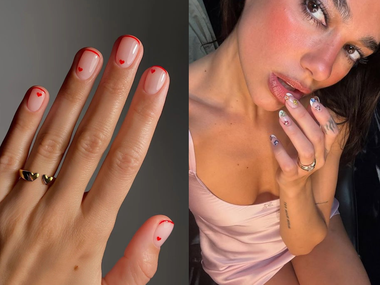 Сердечки — очевидный мотив 14 февраля, но легко уйти от прямолинейности за счет масштаба, цвета и количества деталей. Удачный вариант — сделать сердечки частью нюдовой композиции, а не центральным элементом на каждом ногте.