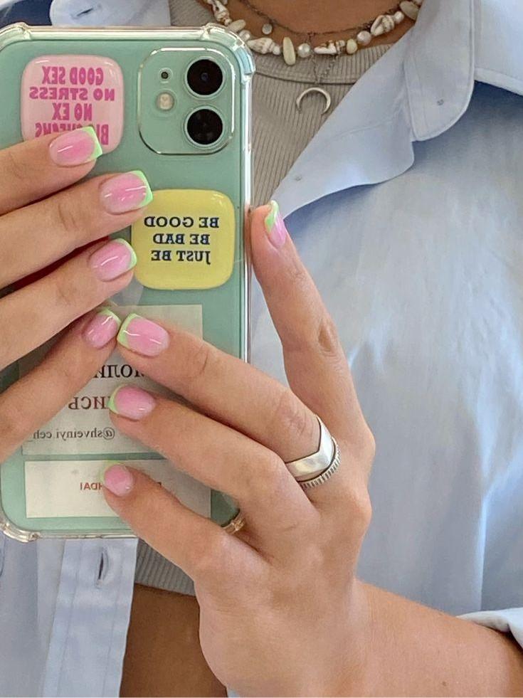 База здесь играет ключевую роль. Лучше ориентироваться на нюд, максимально близкий к тону кожи: молочный, натурально-розовый, бежевый. Тогда цветная полоска выглядит аккуратно и создает ощущение собранности.