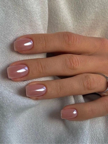 На короткой и средней длине зеркальный маникюр выглядит наиболее чисто. Мягкий квадрат, овал или короткий миндаль позволяют покрытию не перетягивать внимание на форму и не утяжелять кисть. Базовые варианты — холодное серебро, приглушенное золото, оттенок шампанского, светлый розовый металлик.