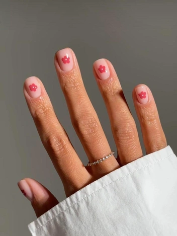 Цветочный маникюр ассоциируется с романтикой, и для 14 февраля это один из самых очевидных вариантов. Вопрос в подаче: от нее зависит, будет ли дизайн выглядеть детским или современным. Самый универсальный путь — нюдовая база и минималистичные цветочные элементы. Вместо объемных цветов с множеством деталей лучше использовать лаконичные силуэты: один бутон, веточка с мелкими лепестками, пара асимметричных цветков на разных ногтях.