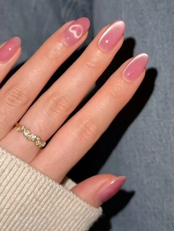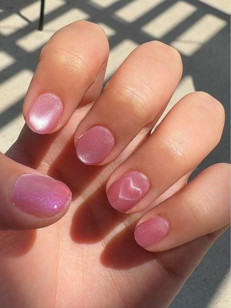 Оттенки лучше подбирать в одной гамме, без резких скачков. Это могут быть молочно-розовый, пудровый, пыльно-розовый, нежно-ягодный и чуть более насыщенный конфетный розовый. За счет близости тонов руки выглядят аккуратно, а маникюр не кажется перегруженным. Если хочется небольшого усиления, можно добавить тонкий шиммер на один-два ногтя или сделать почти незаметную вертикальную полоску с мелким сиянием по центру пластины.