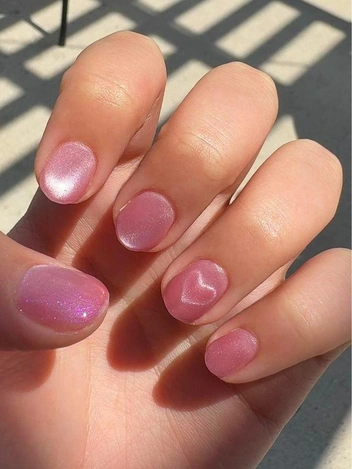 Шиммер может быть плотным или почти прозрачным. Мелкий глиттер дает подсветку без явной текстуры. Интересно выглядит прием, когда сердечки сначала выкладывают фольгой или блестками, а затем перекрывают тонким слоем молочного геля. Рисунок будто уходит в глубину и становится мягче, а поверхность остается гладкой.