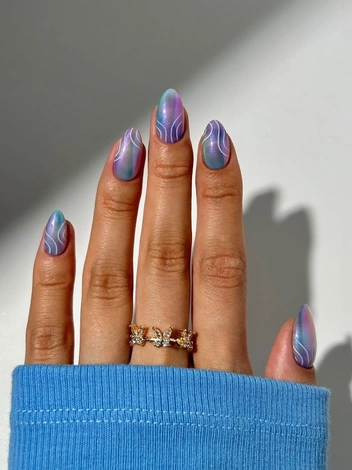 Для создания маникюра потребуются мультихромные лаки, которые бывают различных видов: хамелеоны, дуохромы, триохромы и даже полихромы. Хамелеоны, как и их тезки в природе, меняют цвет в зависимости от освещения и угла обзора. Дуохромы, как следует из названия, демонстрируют два основных цвета. Триохромы, соответственно, переливаются тремя оттенками, а полихромы — целой палитрой красок.