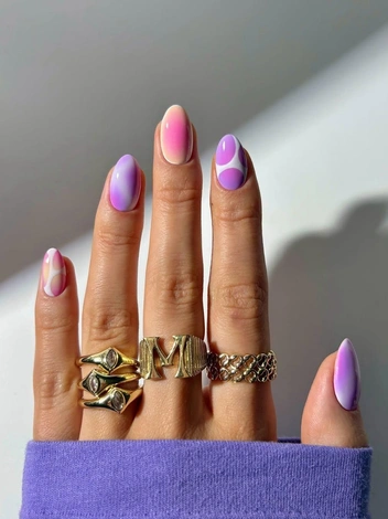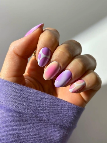 Существует множество вариаций зефирного маникюра. Классический вариант — сделать однотонное покрытие в двух оттенках на всех ногтях и на некоторых из них прорисовать сладкие узоры. Более интересный и креативный дизайн получится, если сделать цветовую растяжку по всей ногтевой пластине (читайте также: «Ледяной шампань»: самый необычный маникюр Дженнифер Лопес, который стал трендом).