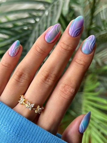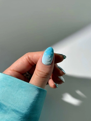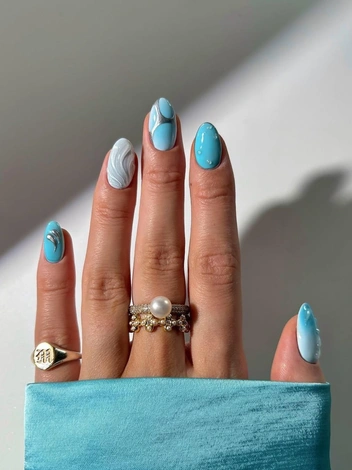 Нежность морской волны, прозрачная голубизна океана и свежесть бриза — все в этом маникюре на 8 марта собрано, чтобы, не дожидаясь праздника, перенестись в расслабленную атмосферу предстоящего летнего отпуска.
