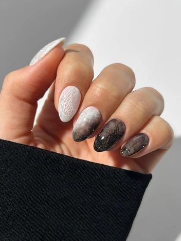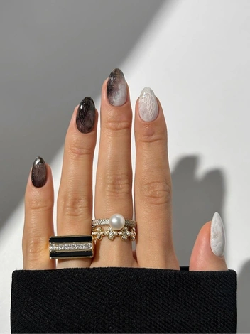 Дизайн предполагает использование прозрачной или нюдовой базы, которая позволяет пузырькам выступать в качестве основного акцента. Пузырьки можно рисовать различными способами. Самый простой — использовать тонкую кисть для нейл-арта и наносить небольшие круги разных размеров. Для создания эффекта объема можно использовать несколько слоев лака разных оттенков, постепенно уменьшая диаметр каждого следующего круга. Еще один интересный вариант — использование дотса для создания идеально ровных пузырьков. Дотсом можно наносить точки разных размеров, варьируя силу нажатия.