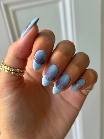 Двойное омбре в маникюре — сложный дизайн, сочетающий плавный переход цвета не только от основания к кончику ногтя, но и по горизонтали, создавая многомерный эффект. Представьте: на ногтевой пластине гармонично перетекают два разных цветовых дуэта, например, от нежно-голубого у кутикулы к лавандовому на середине ногтя, и от лавандового к глубокому фиолетовому на кончике.