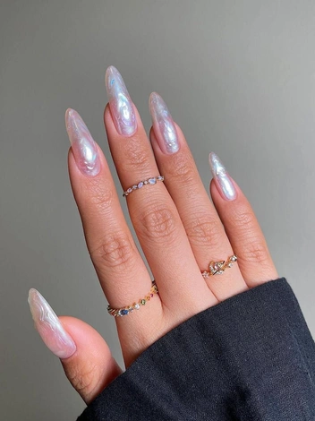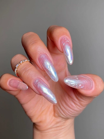 Если же вам захотелось чего-то минималистичного и при этом нарядного — перламутровый цвет придется как никогда кстати. Такой дизайн будет уместен как на коротких, так и на супердлинных ноготках.